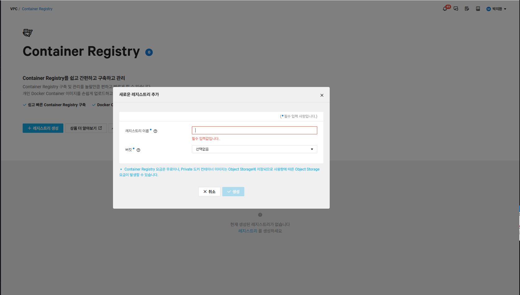 ❗️Container Registry 생성에 앞서 이미지 저장을 위해 사전에 Object Storage 버킷을 생성해야 한다.