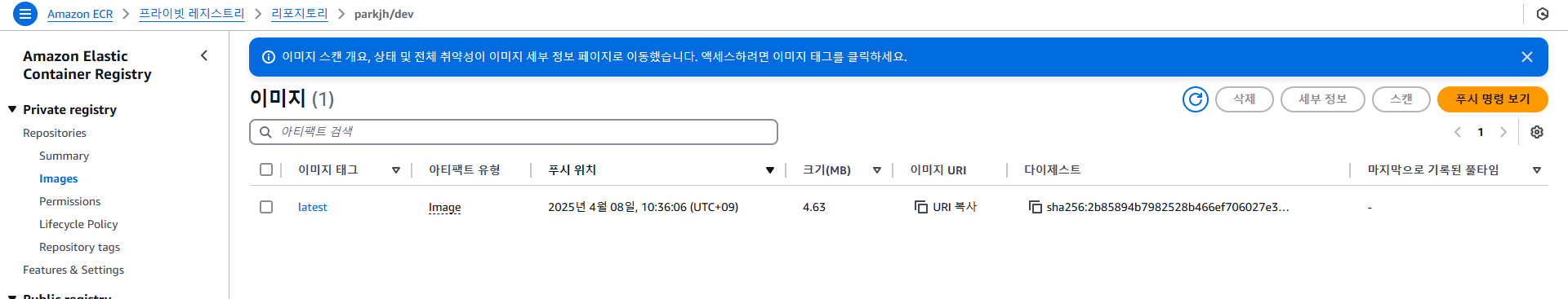 AWS 콘솔에서 push 된 이미지를 확인한다.