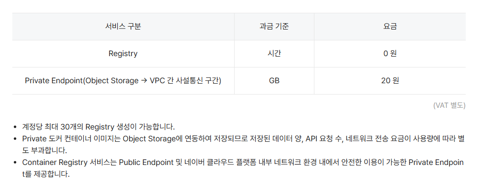 네이버 클라우드의 Container Registry 서비스는 기본적으로 무료이다. 다만 Image 를 Object Storage 에 쌓기 때문에 별도의 Object Storage 비용이 청구된다.