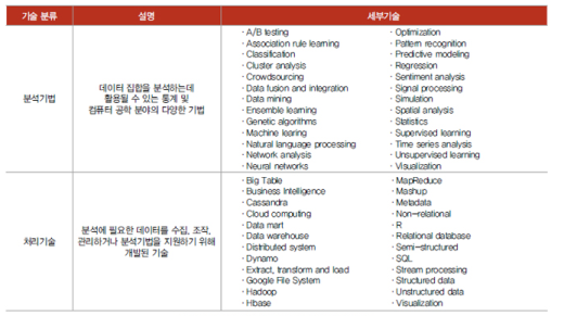 빅데이터는 기존 데이터베이스 관리도구의 능력을 넘어서는 대량의 정형/비정형 데이터의 집합을 포함한 데이터로부터 가치를 추출하고 결과를 분석하는 기술이다[5].