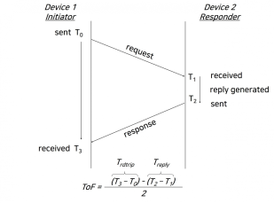 ToF는 신호의 송수신 시간을 측정해 위치를 측위하는 기술이다. [그림 3]과 같이 시간을 측정하기 위해 1번 디바이스에서 송신 시간에서 수신 시간의 차에서 2번 다바이스에서 1번 디바이스로 전송하기 이전의 시간의 차를 뺀다. 이후 2로 나눠 ToF를 계산한다. ToF는 신호의 송수신 시간으로 위치를 판별하기 때문에 각 디바이스별로 시간동기화가 반드시 되어야 한다. 또한 2장에서 UWB의 통신기법에서 보았던 것처럼 UWB는 넓은 대역에서 짧은 펄스신호를 이용하여 높은 정밀도와 빠른 속도를 보인다. ToF에서 높은 정밀도에서 낮은 오차를 보이기 때문에 통신과정에서의 속도와 정밀도가 중요하다. 하지만 장애물에 영향을 받아 반사파의 시간이 송/수신 될 경우 높은 오차를 보일 수 있다.