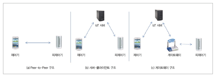 아래 [그림]은 IoT의 네트워크 구조이다. 본 프로젝트에서는 피제어기의 데이터를 IoT 서버로 송신하고 IoT 서버에서는 웹 서비스를 운용하여 제어기(Web/App)에서 제어하는 서버-클라이언트 구조로 운용한다.