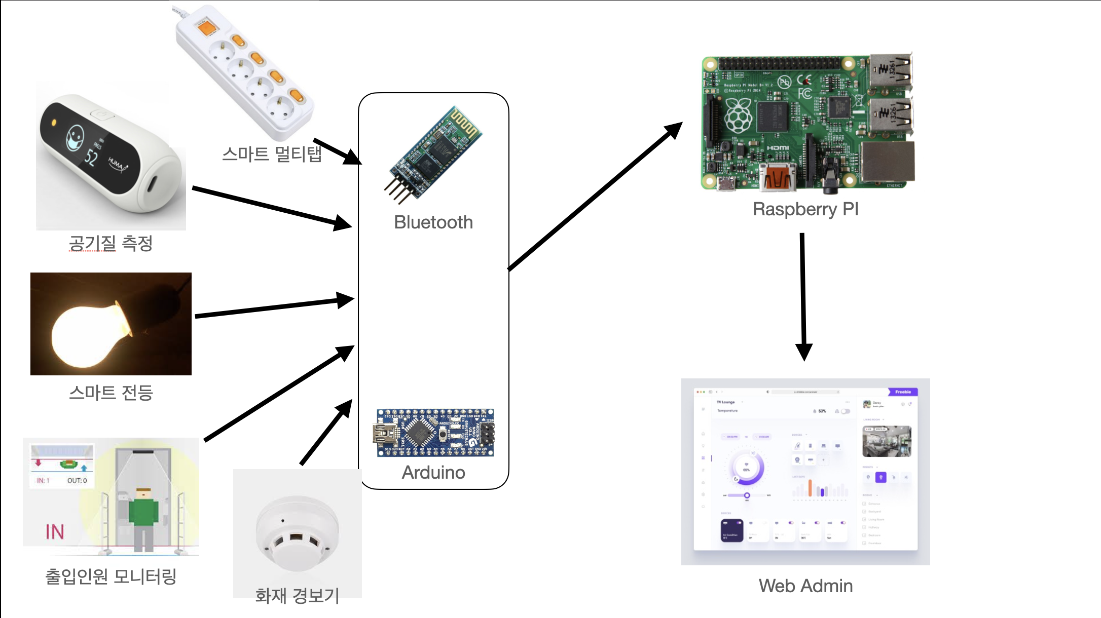 본 프로젝트의 아래의 [그림]과 같은 구조로 이뤄져 있다. 각 센서로부터 아날로그/디지털 형태의 데이터를 Arduino(MCU)가 수신받고 일정한 형태로 가공하여 Raspberry PI(Server)로 Bluetooth를 통해 데이터를 송/수신 한다. 센서의 데이터를 송/수신 받은 Raspberry PI(Server)는 Apach Web을 운용하여 Web 페이지를 통해 사용자가 센서의 상태를 모니터링하거나 제어하는 서비스 형태를 제공한다. 더 나아가 별도의 애플리케이션을 제작하여 집안에서 이뤄지는 각종 이벤트에 대해 알림으로 수신받아 대응할 수 있도록 발전시킬 예정이다.