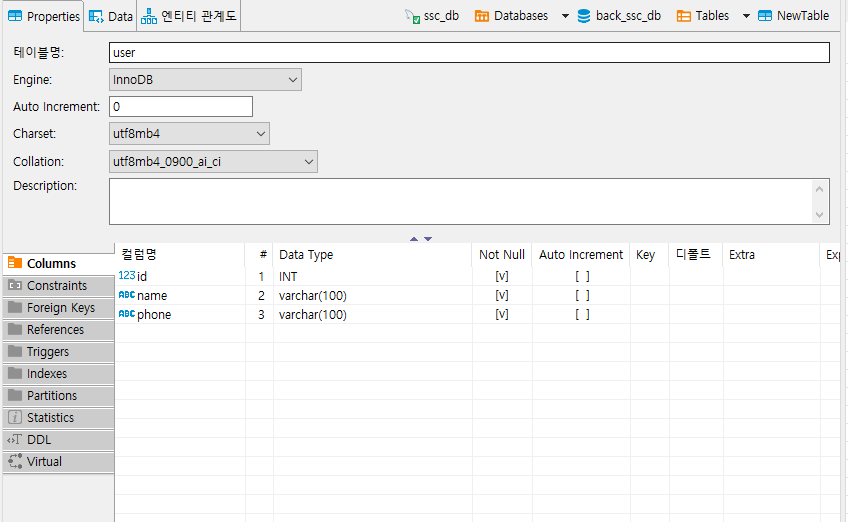 user 테이블에 id(int), name(varchar) phone(varchar) (PRI:id) 컬럼을 추가한다.
