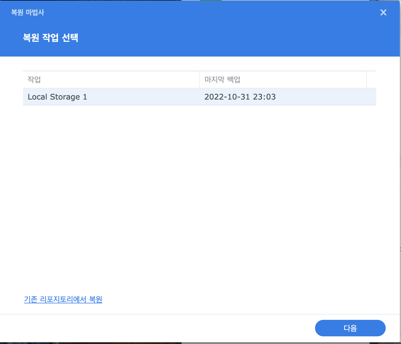 데이터 복원이 필요하다면 아래의 복원 버튼을 누른다.