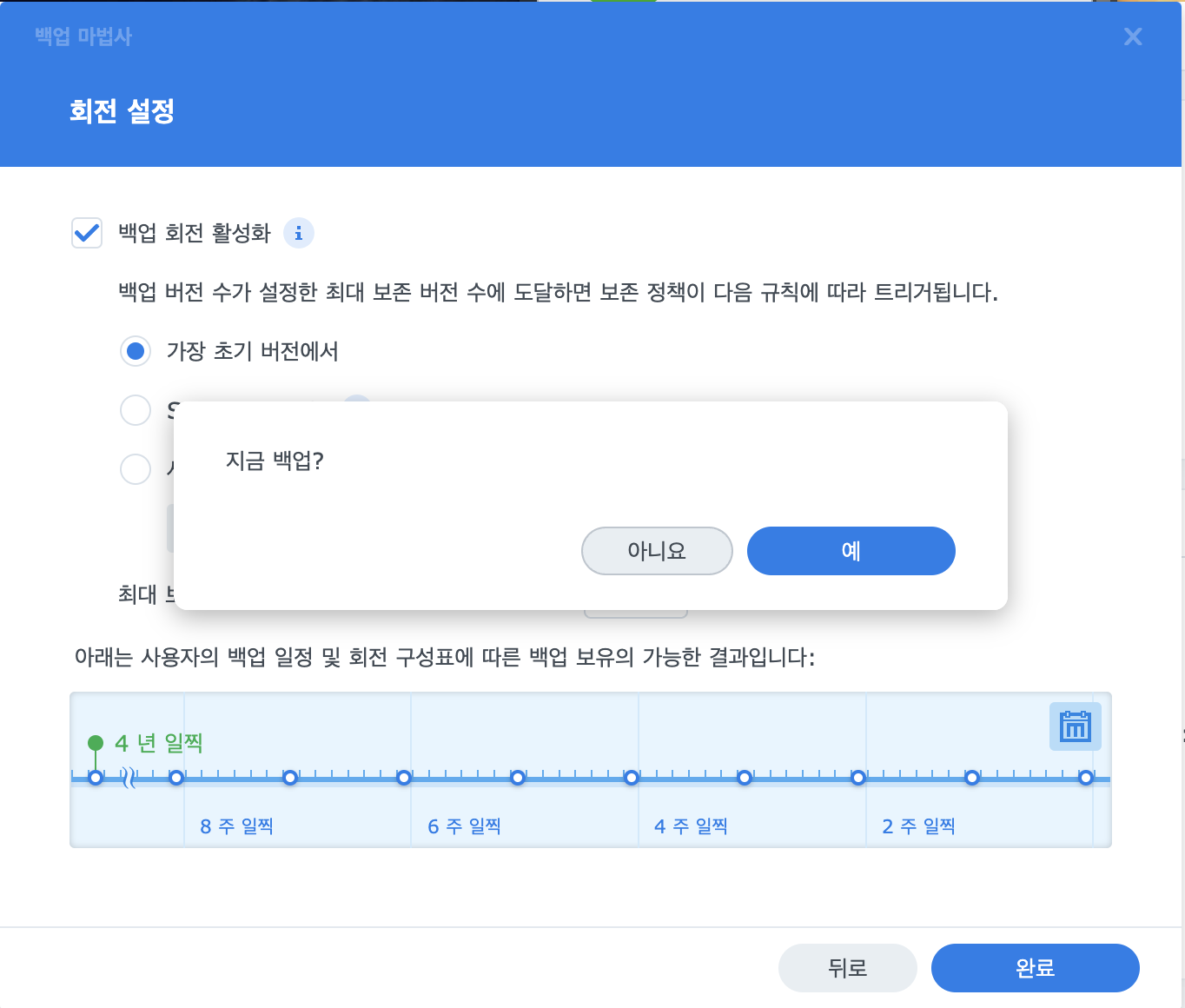 완료를 눌러 진행하여 지금 백업을 수행한다.