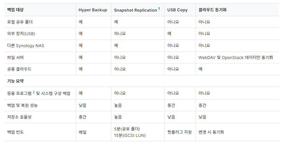위 표를 요약하자면 시놀로지사에서 제공하는 백업 솔루션은 Hyper Backup, Snapshot Replication, USB Copy, 클라우드 동기화를 지원하고 있다.