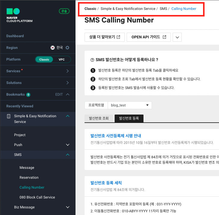 SMS 서비스는 사용자가 입력한 임의의 번호를 이용하여 발송할 수 없다. SMS - Calling Number에서 발송할 휴대전화 인증을 수행한다.