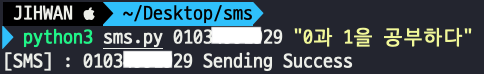 작성한 해당 파이썬 코드를 실행한다. 실행인자로 수신자 핸드폰 번호와 문자 내용을 전달한다.