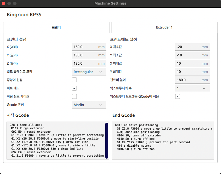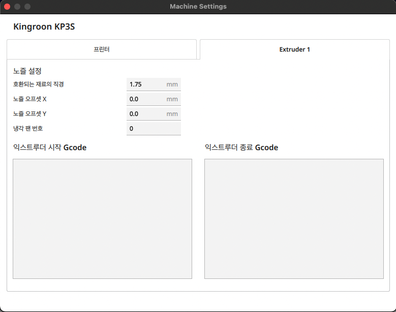 '프린터'와 'Exruder1' 탭으로 이뤄져 있는데 프린터는 프린터 설정과 관련된 내용이고 익스트루더는 노즐(압축기)에 대한 설정이다. 아직까지 자세한 내용은 모르겠다. 일단은 기본 디폴트 값을 따른다.