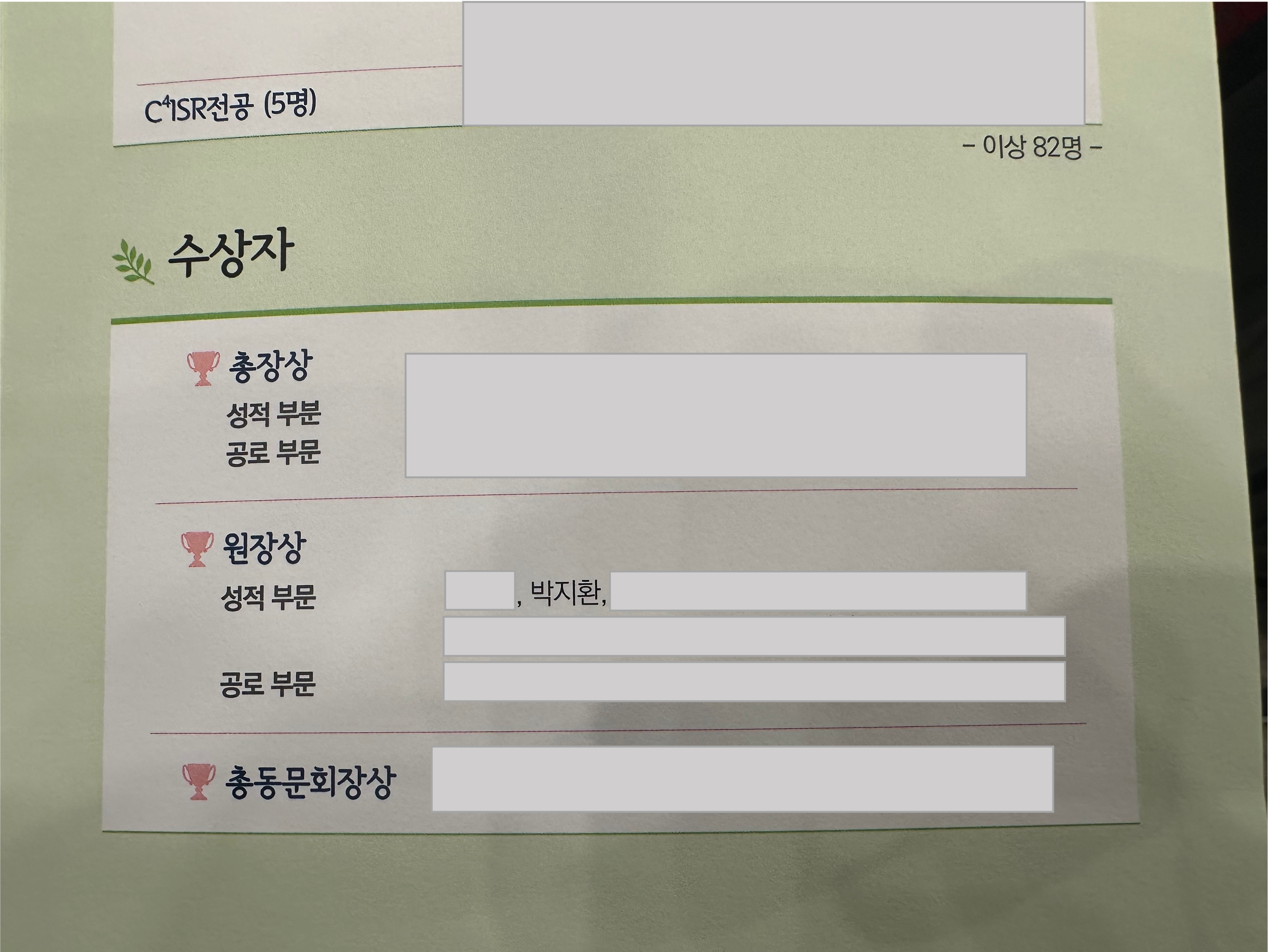 석사과정에서 성적이 크게 중요한 것은 아니지만 성적우수 부분에서 상패를 수여받았다. 과에서는 수석으로 상패를 수여받았다. 그래도 2년동안 열심히 학업에 임했구나 하는 생각에 뿌듯한 마음이 들었다.