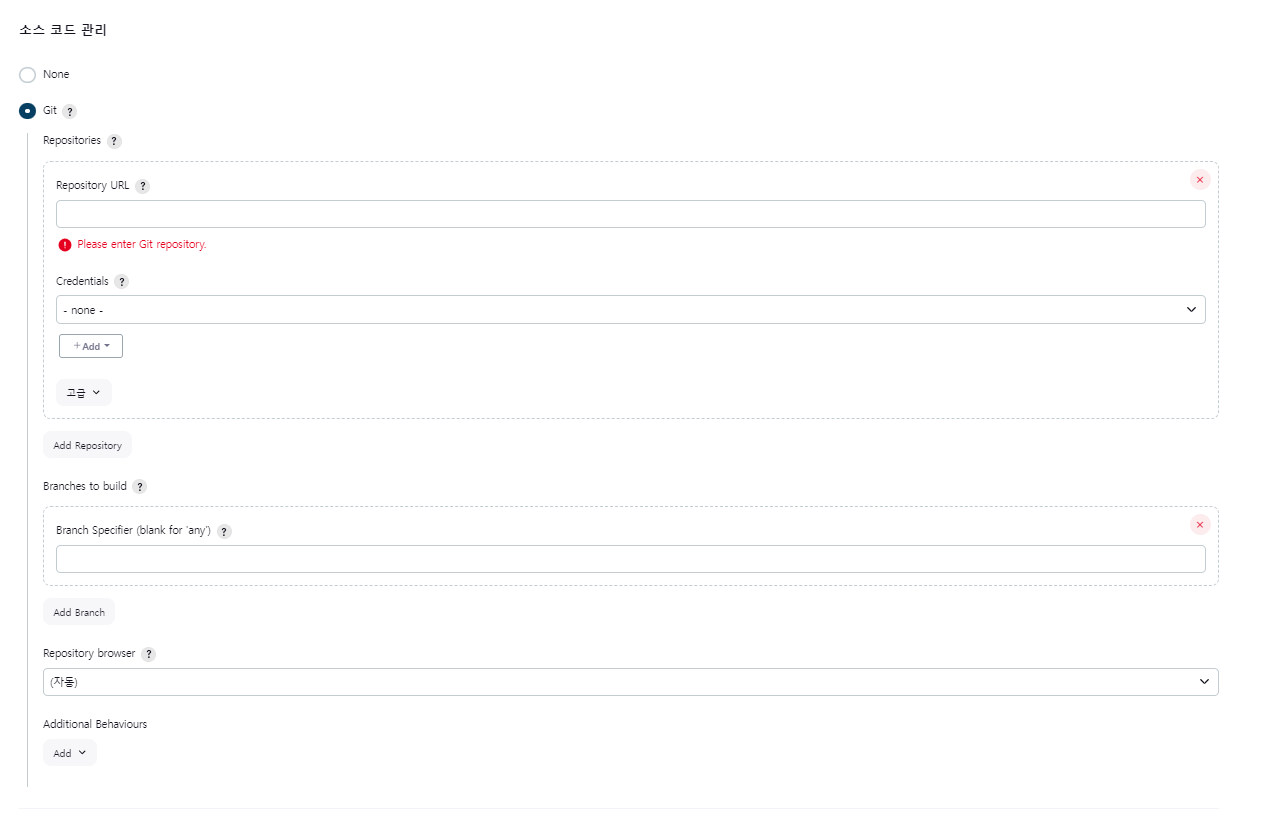 - Branches to build : Jenkins에서 Bulid 할 branch 이름 기입