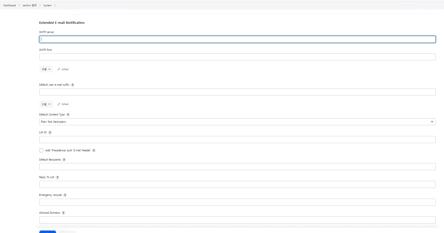 플러그인 설치 후 Dashboard - Jenkins 관리 - System으로 이동하여 페이지 스크롤을 내려 “Extended E-mail Notification” 항목을 찾는다.