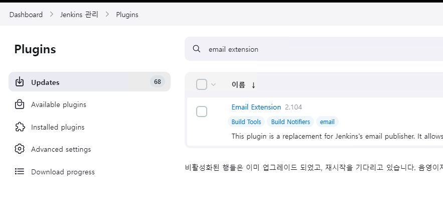 Dashboard - Jenkins 관리 - Plugins에서 “Email Extension”을 검색하여 설치한다.