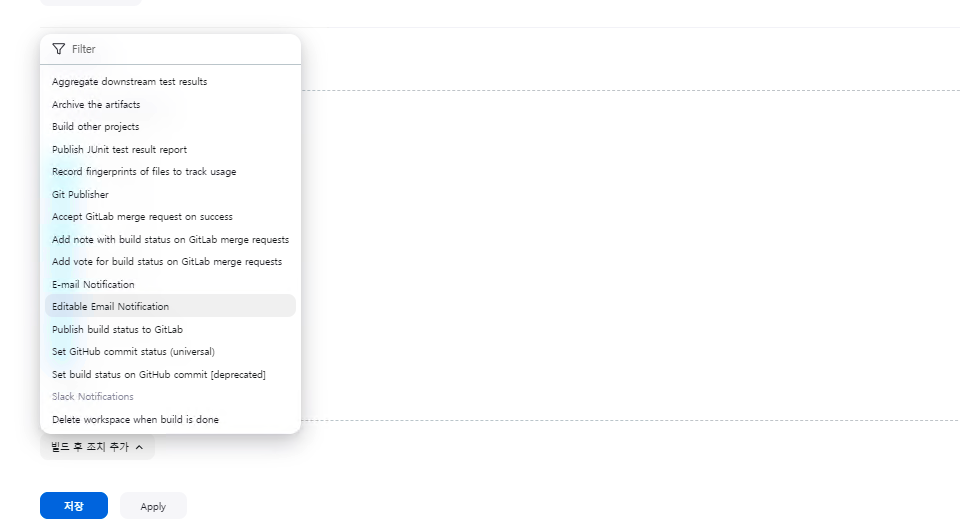 다음 메일을 발송하고자하는 Item으로 이동하여 구성 - 빌드 후 조치 항목에서 Editable Email Notification을 추가한다.